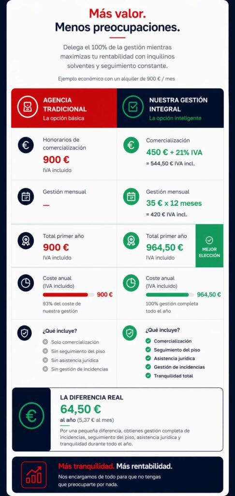 Una agencia tradicional alquila tu piso, cobra un mes de renta y ahí termina su trabajo. A partir de ese momento, cualquier incidencia, problema o gestión recae sobre ti.